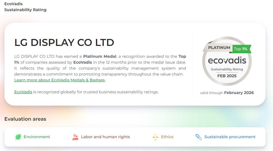 Nu het belang van ESG-beheer door bedrijven voor duurzame ontwikkeling wereldwijd blijft toenemen, voert LG Display verschillende gerelateerde activiteiten uit onder zijn ESG-slogan: "True Display for a Sustainable Future." Als erkenning voor deze inspanningen heeft LG de hoogst mogelijke EcoVadis-duurzaamheidsbeoordeling voor 2025 ontvangen. Met de toekenning van de platina medaille heeft het wereldwijde ESG-beoordelingsbureau EcoVadis LG Display geplaatst in de top 1 procent van bedrijven wereldwijd.